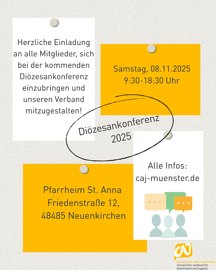 Wir laden euch recht herzlich zu unserer außerordentlichen Diözesankonferenz am 19.12.2023, von 19.00-22.00 Uhr, in die Jugendbildungsstätte Saerbeck, ein.